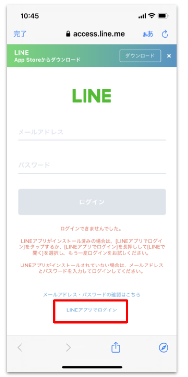 下記のようなLINEへのログイン画面が表示された場合は、下部にある「LINEアプリでログイン」をタップするとログインして進むことができます。