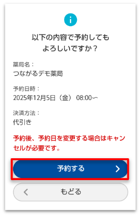 - 確認画面が表示されるので、【予約する】をタップします。以上で予約が完了します。