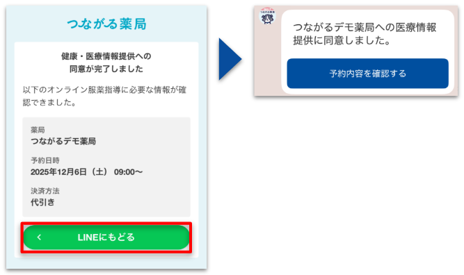 - つながる薬局に戻るので、【LINEにもどる】をタップして終了します。トーク画面に同意が完了した通知が届いています。